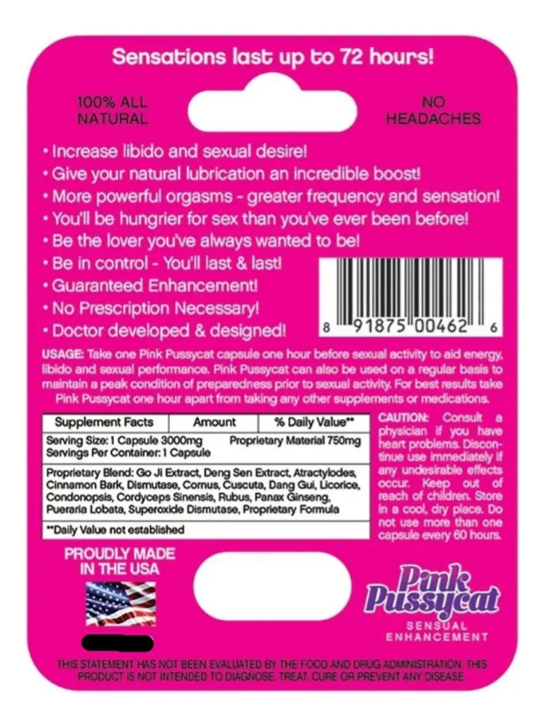 MODO DE EMPLEO: Toma una cápsula de Pink Pussycat una hora antes de la actividad sexual para aumentar la energía, la libido y el rendimiento sexual. Pink Pussycat también puede usarse regularmente para mantenerte en óptimas condiciones antes de la actividad sexual. Para obtener mejores resultados, toma Pink Pussycat una hora después de tomar cualquier otro suplemento o medicamento. Como con cualquier suplemento oral, consulta siempre con tu médico antes de tomarlo. No se recomienda su uso en pacientes con enfermedades crónicas ni diluir su contenido.
